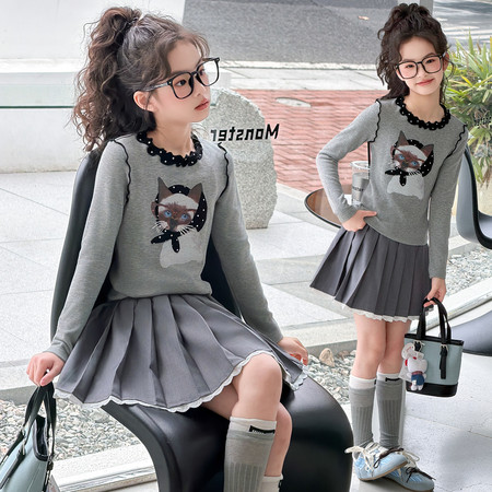 雪*家下载视频“2932款波点猫打底衫百褶裙套装”